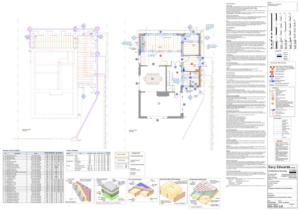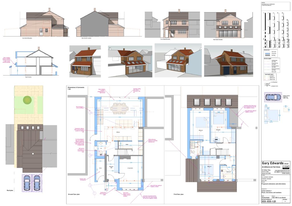 This is an example of an annotated scheme drawing that I produced to show the client the site constraints along with some possible options for extending and altering their property.